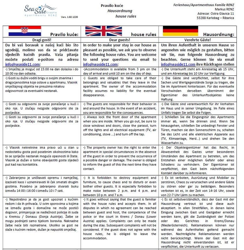 Für uns ist es wichtig, dass alle Gäste in unserem Apartmenthaus die Hausordnung unbedingt einhalten. Es ist uns ein Anliegen, dass wir jedem einzelnen Gast das Recht auf erholsame Tage bieten. Daher ist es unabdingbar, dass jeder unserer Urlauber unsere Hausordnung in vollem Umfang versteht und zur Kenntnis nimmt. Man kann sich gleich damit vertraut machen, sodass ein Zusammenleben im Einklang mit anderen Gästen von Beginn an funktioniert.