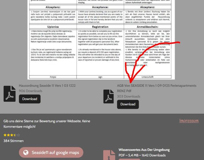 Bitte bedenken Sie, dass der Hauseigentümer/Hauswirt keine Haftung über verloren gegangen Gegenstände übernimmt! Bei der Buchung haben Sie auch unsere allgemeinen Geschäftsbedingungen dahingehend akzeptiert! Diese stellen wir Ihnen als download auf dieser Seite weiter unten zur Verfügung...